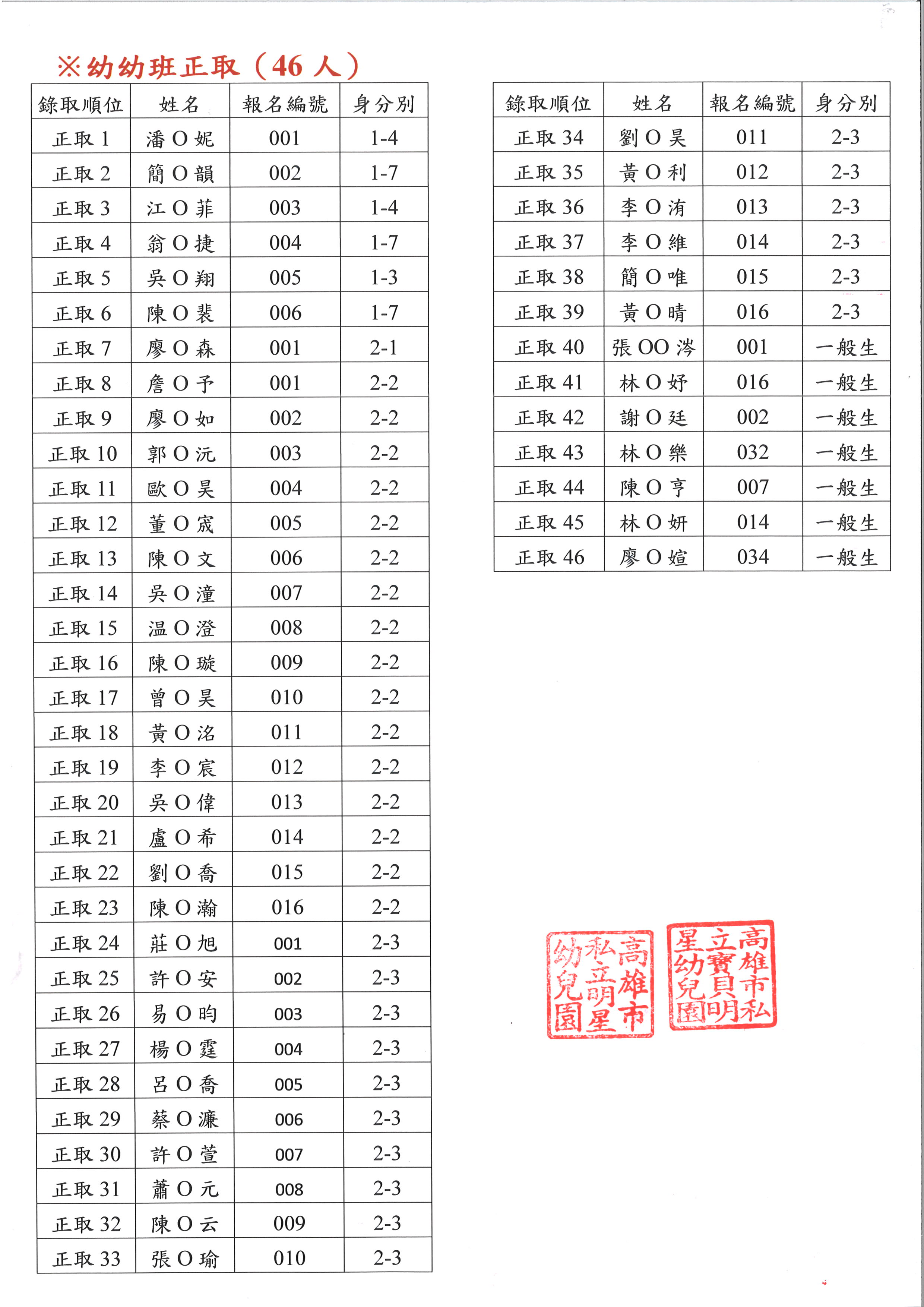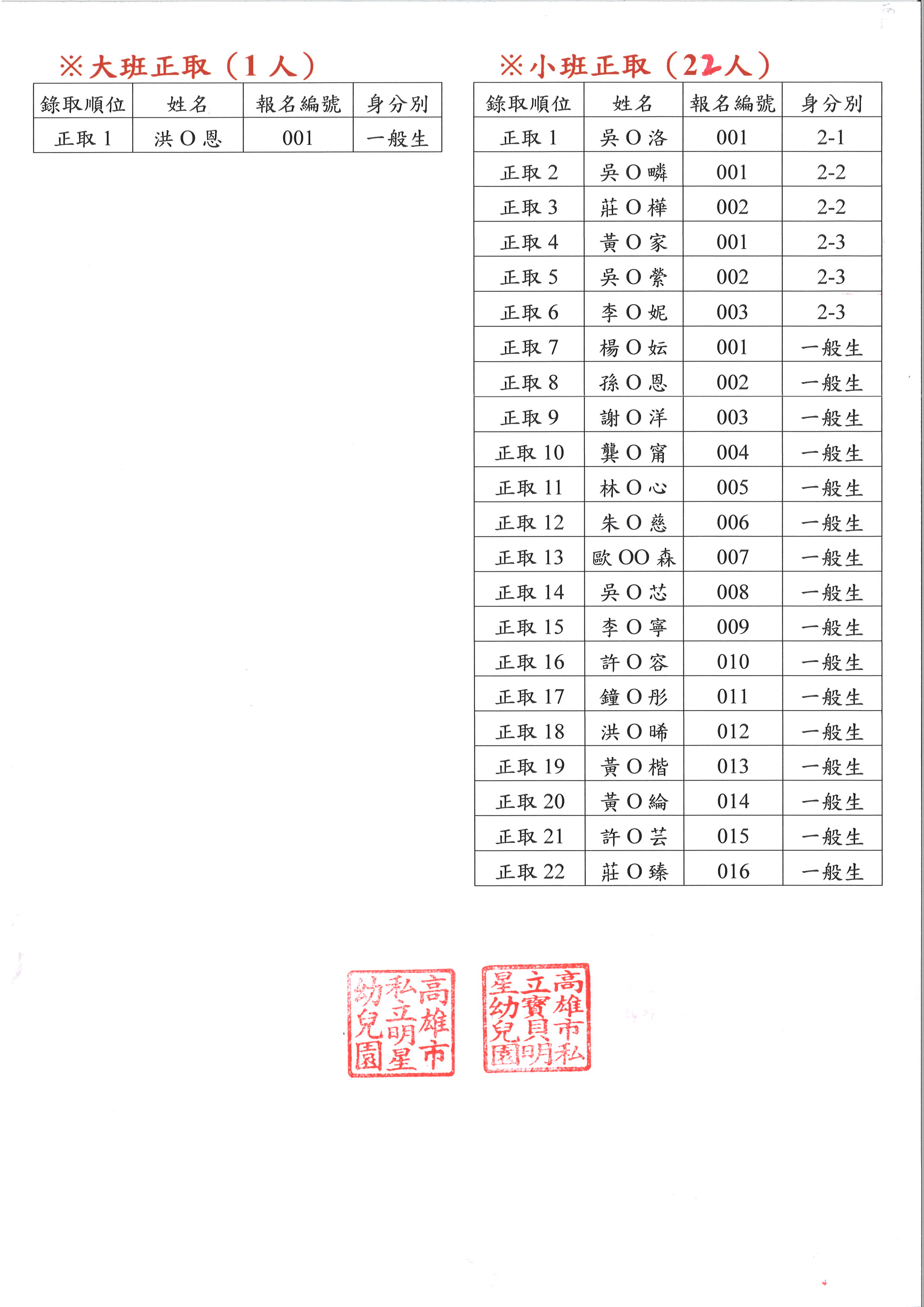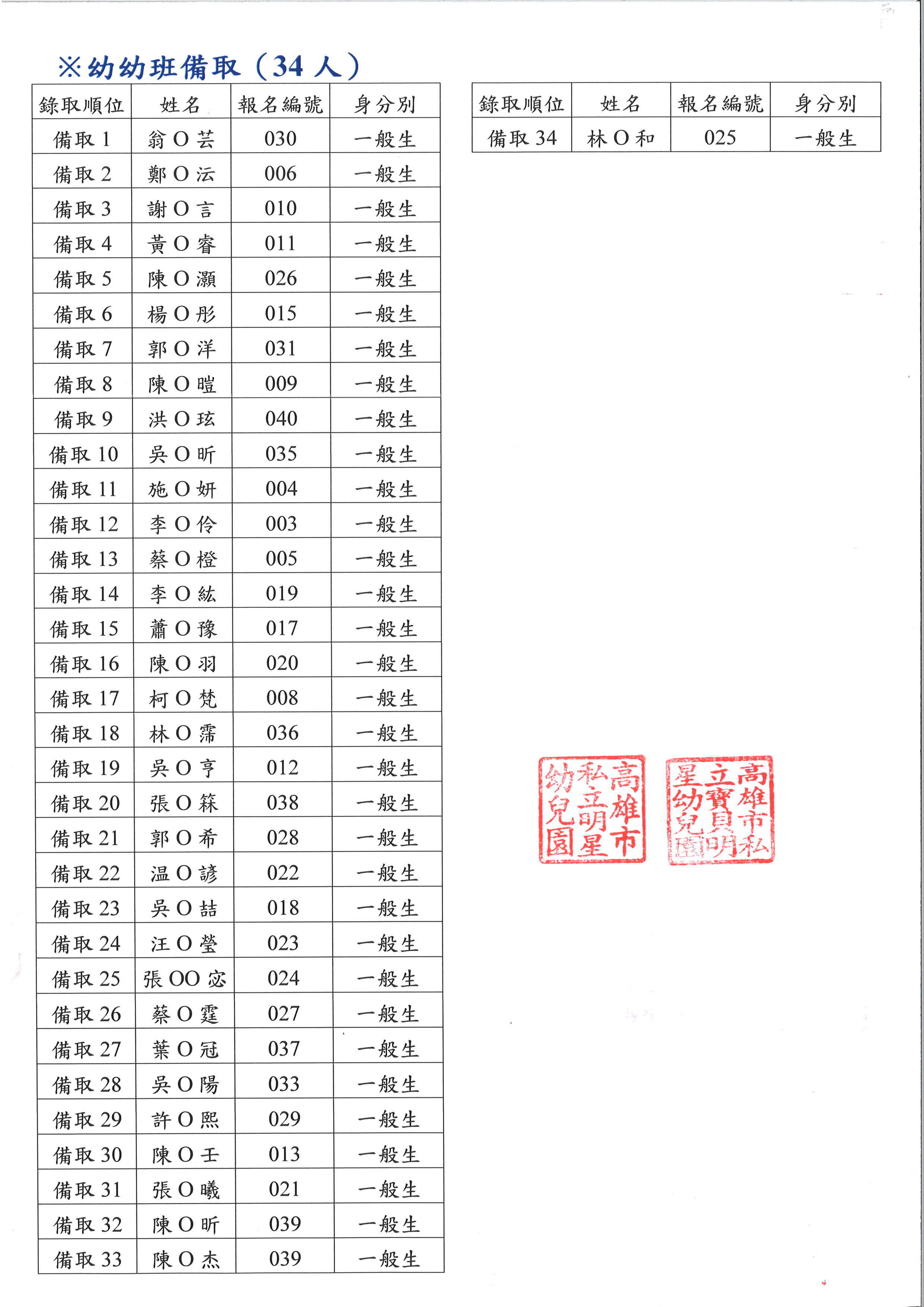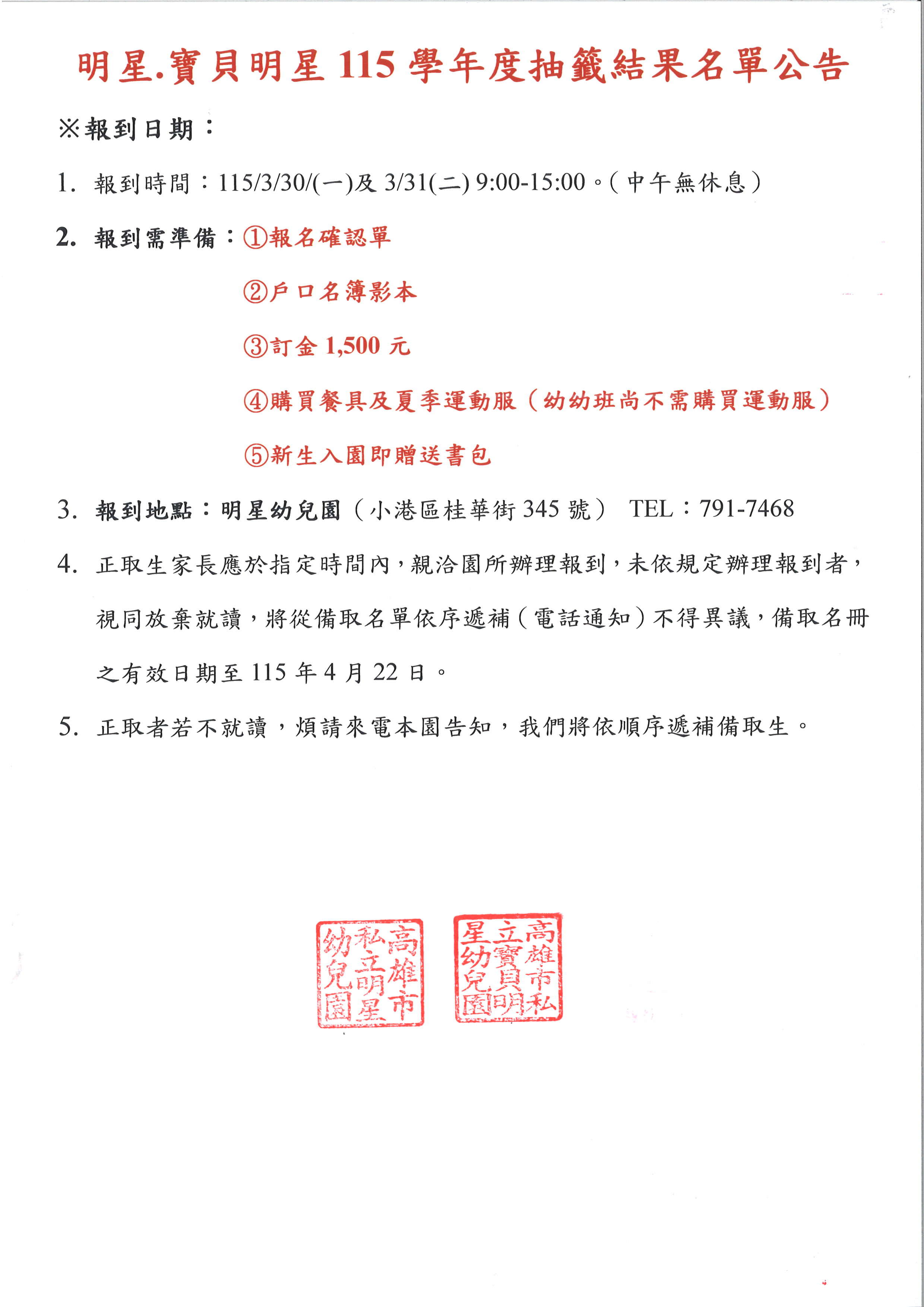 📣115學年度<明星.寶貝明星幼兒園 新生抽籤結果名單公告>